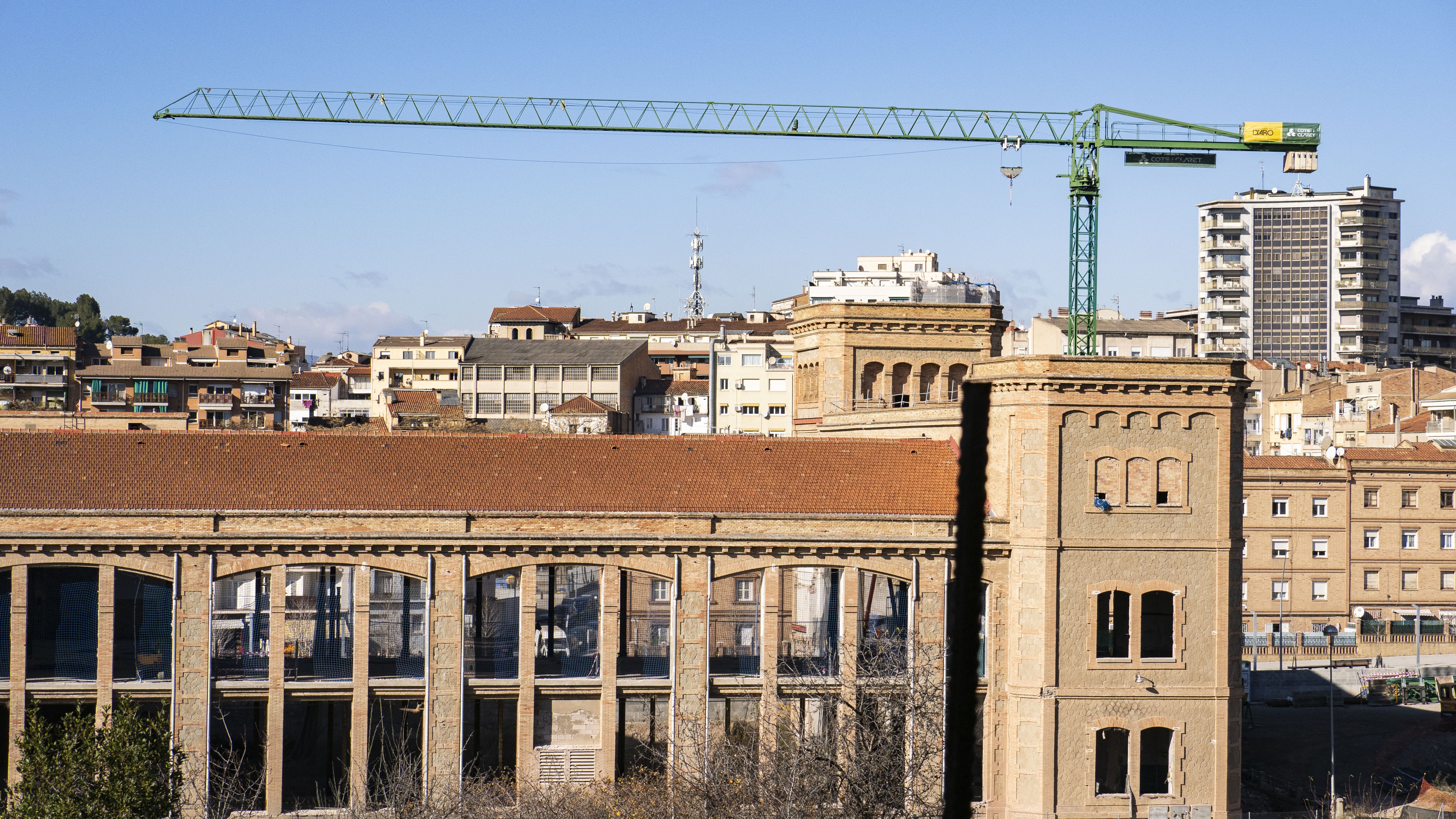 La Fàbrica Nova de Manresa amb la grua per fer les obres de reforma