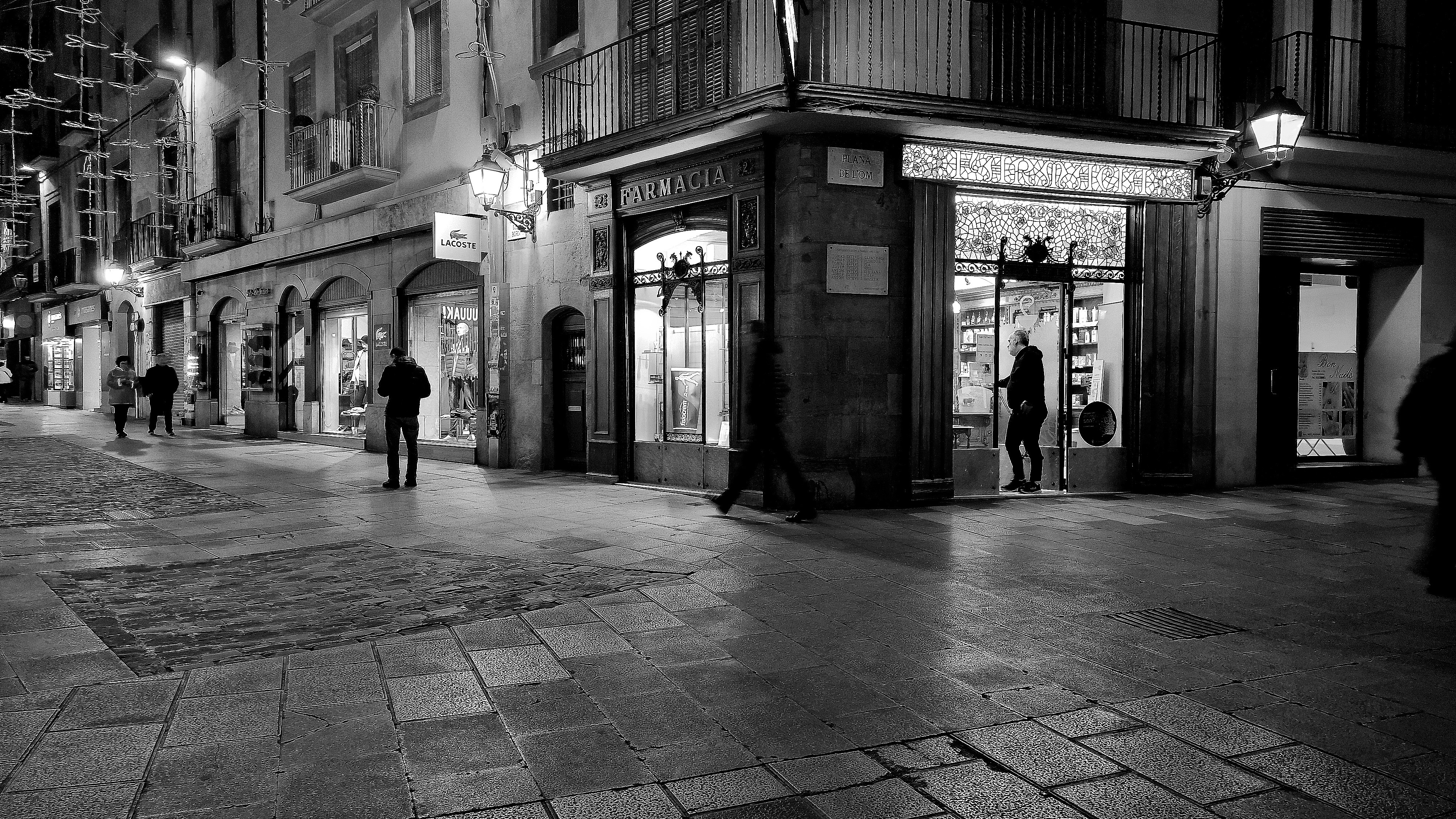 Perspectiva en blanc i negre de la Farmàcia de la Plana de l'Om de Manresa