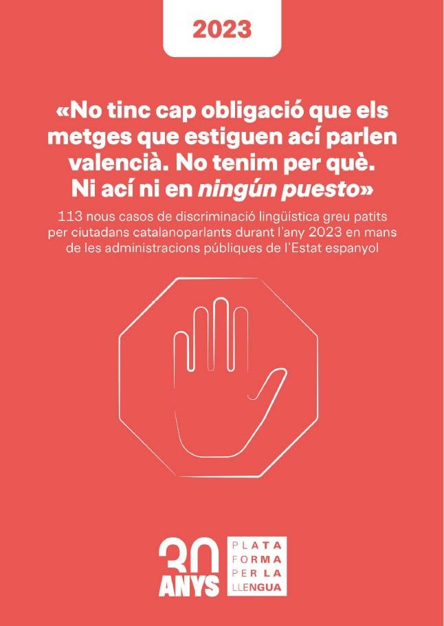 el report anual de discriminacions lingüístiques de 2023, un recull de casos en què les diferents administracions públiques espanyoles han discriminat usuaris catalanoparlants pel simple fet d'expressar-se o voler-se expressar en català. Aquestes discriminacions, que es produeixen en tots els territoris catalanoparlants de l'estat, es concreten en exigències i pressions de parlar en castellà, en dilacions i obstacles pel fet de parlar en català i en l'impediment d'accedir al servei o a l'atenció per aquest mateix motiu.