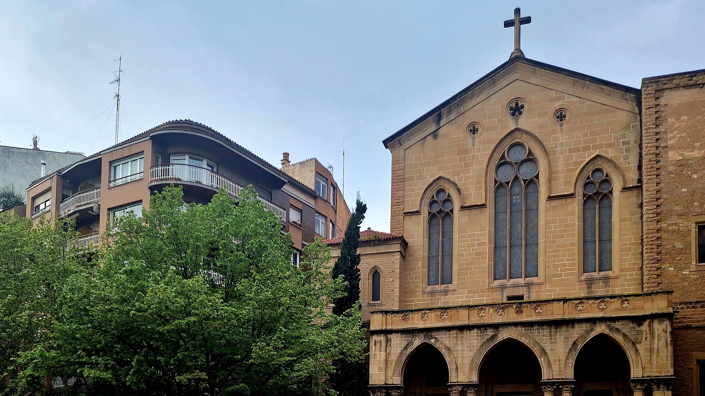 Fotografia de la façana de l'església de Crist Rei des de la plaça de Neus Català de Manresa.