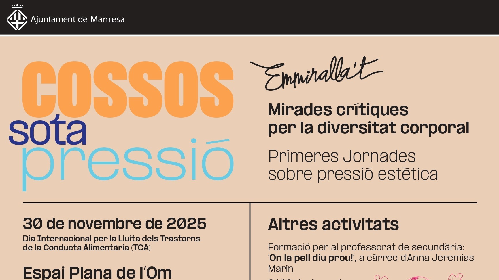 L’Ajuntament de Manresa, a través de les Regidories de Feminismes i LGTBI, Joventut i Salut, donarà continuïtat enguany a la Campanya Emmiralla’t amb l’organització de les primeres Jornades sobre pressió estètica ‘Cossos sota pressió: mirades crítiques per la diversitat corporal’. L’objectiu de la iniciativa és sensibilitzar sobre la pressió estètica com a problemàtica social i fomentar una mirada crítica i respectuosa envers la diversitat corporal. Les activitats centrals tindran lloc el 30 de novembre, coincidint amb el Dia Internacional per a la Lluita contra els Trastorns de la Conducta Alimentària, i es completaran amb una programació descentralitzada durant el mes de desembre.