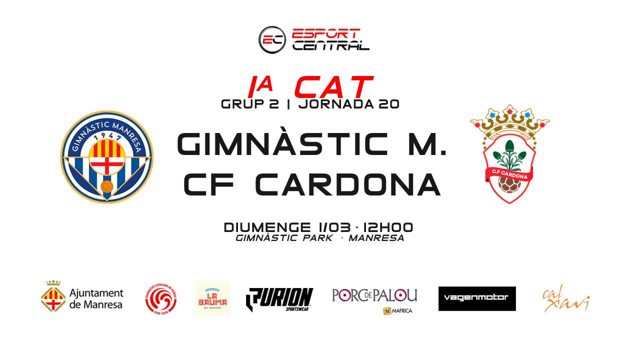 Diumenge, a les 12h00, derbi bagenc a 1a Catalana. El Gimnàstic de Manresa rep la visita del CF Cardona, amb els dos equips en la part mitja de la taula i amb el precedent de la victòria dels manresans a l'anada (0-1).