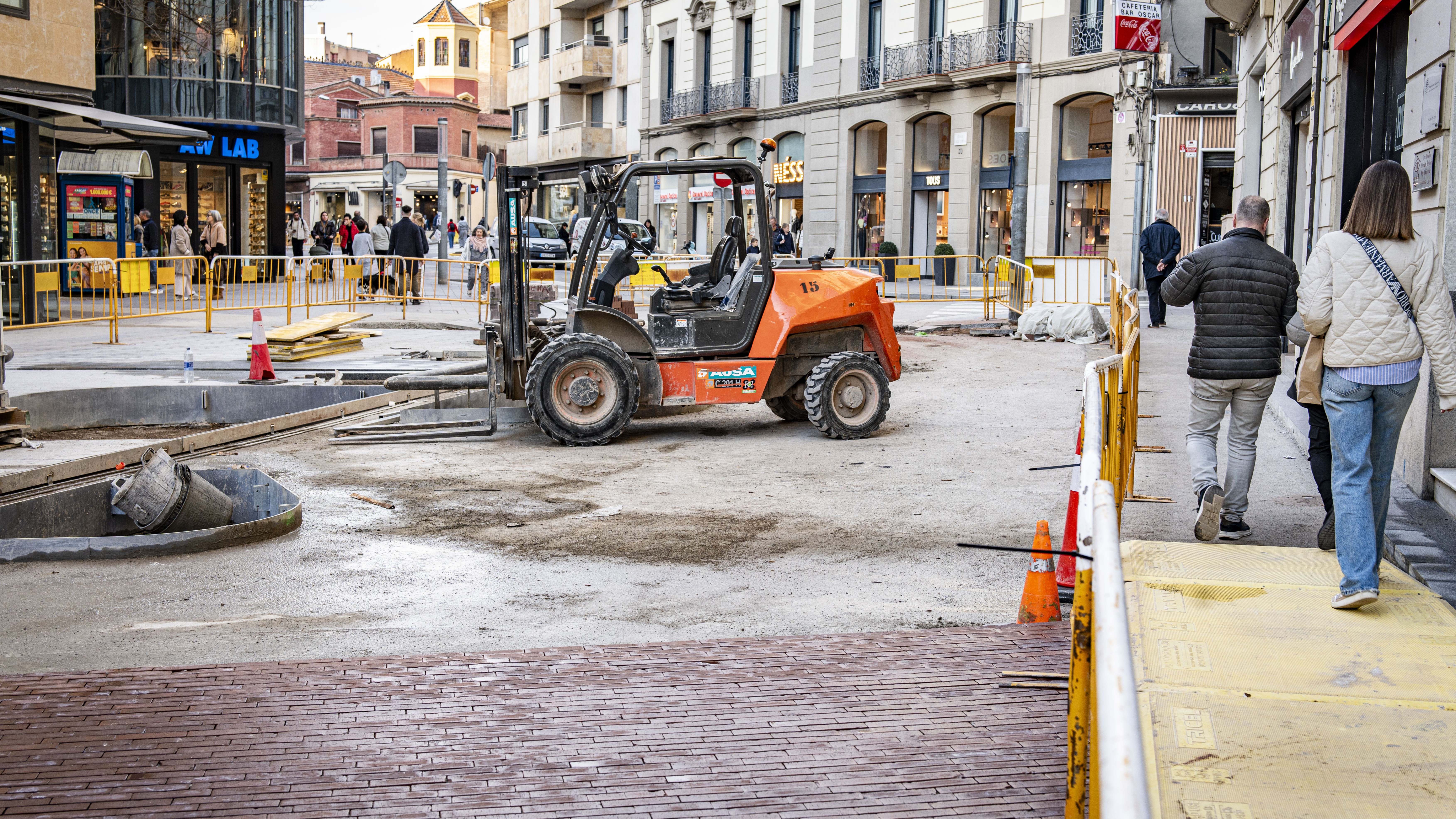 Les obres de transformació del carrer Guimerà de Manresa continuen amb treballs d’urbanització per convertir aquest eix comercial en una illa de vianants. La zona d’obra està delimitada mentre els vianants circulen pels passos habilitats.